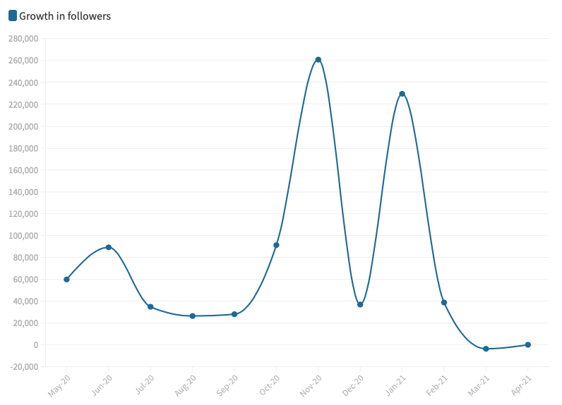 Jake Tapper, one of the most known reporters for CNN in America I thought would be an interesting person to look at, especially as in America there can be a great divide between the news channels CNN and FOX news. There were two instances online for Tapper where I could see spikes in his account, which surprised me as I thought his following might fluctuate slightly more. The first instance was in November 2020, adding 260,752 to his follower count where he released a new documentary “Trumping Democracy: An American Coup”. A documentary that exposed the links of Facebook, Cambridge Analytica and the Trump administration and how together they won over 3 key states in the presidential election, leading to Donald Trump becoming the 45th president of the United States. a big story when it dropped definitely made Tapper a popular reporter to follow. His next spike came in January 2021 where he gained 229,532 followers on twitter. This stemmed from when the Capitol got stormed, furled by trump. Tapper was one of the main correspondents on CNN covering this story for two days. A major event for history, which had people glued to news outlets, especially CNN.