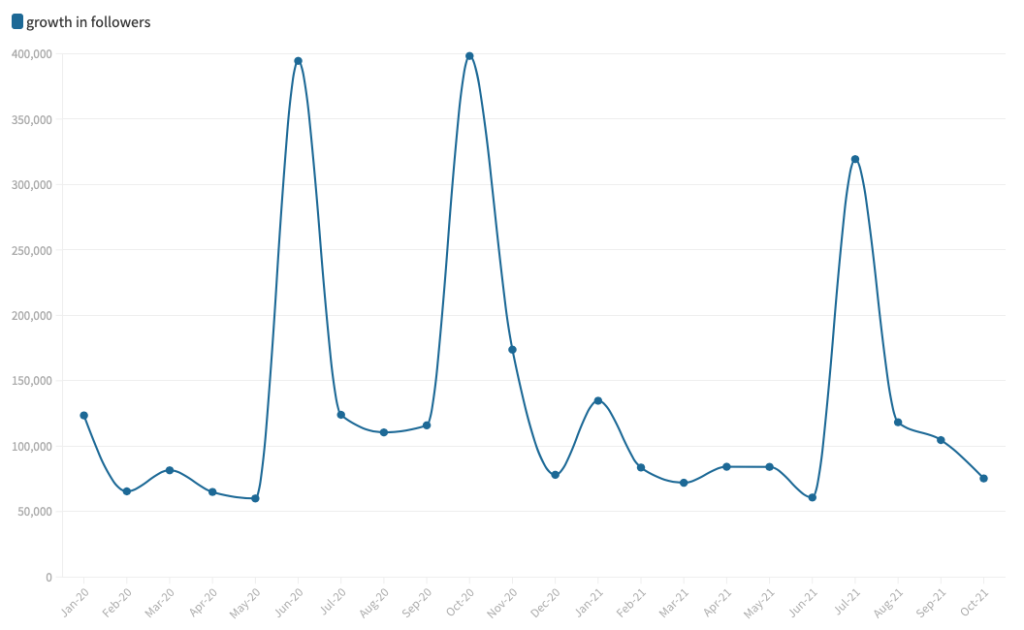 The first spike in followers we see is in June 2020, with his follower count going up by 394,483 in the month alone. This was no coincidence, as this is when his campaign began for the school meals. He wrote an open letter to the government of the UK, published to all his social media accounts explaining his struggles growing up and pleading to help kids depending on school meals. His followers drop again till October, where he gains another 398,240 followers for the month which comes after the government reject his proposal for a school meal plan. Rashford’s support continued online, making a plans with supermarkets in the UK to help him on his mission to help feed school kids in needs. This campaign has progressed to the government pledging £170million to help his campaign. After this was announced he now has a series across his instagram with a chef showing kids how to cook healthy meals with a small amount ingredients.